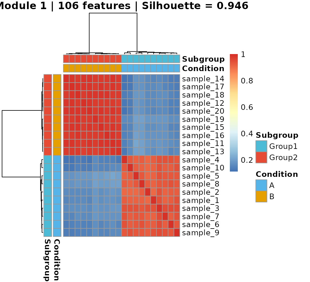 main = sprintf("Module %d | %d features | Silhouette = %.3f",